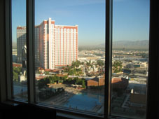 カーテンを開けると今日もとってもいい天気。お向かいのトレジャーアイランドホテルが朝日を浴びている。