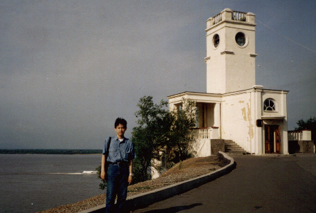 新潟から出発し最初の目的地ハバロフスクにて。後ろはアムール川です。川か海かよくわからないほどの広さです。 |