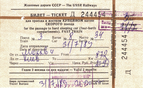 シベリア鉄道のチケット。ちょっと珍しかったのでのせてみました。当時はインツーリストという外国人専用の旅行会社でしか買えませんでした。 |